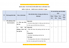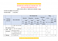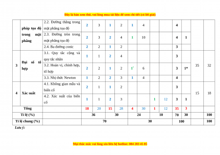 3.2. Hoán vị, chỉnh hợp, 35 32 hợp 2 2 1 2 1* 6 3 1* tổ hợp 3.3. Nhị thức Newton 1 2 2 3 1 4 4 4.1. Không gian mẫu và 2 1 1 2 3 biến cố 4 Xác suất 15 18 4.2. Xác suất của biến 1 1 2 3 1 12 3 1 cố Tổng 18 20 15 28 4 30 1 12 35 3 Tỉ lệ (%) 36 30 24 10 70 30 100 Tỉ lệ chung (%) 70 30 100 100 Lưu ý: