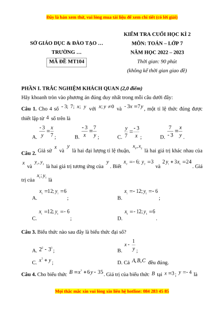 NĂM HỌC 2022 – 2023 MÃ ĐỀ MT104 Thời gian: 90 phút