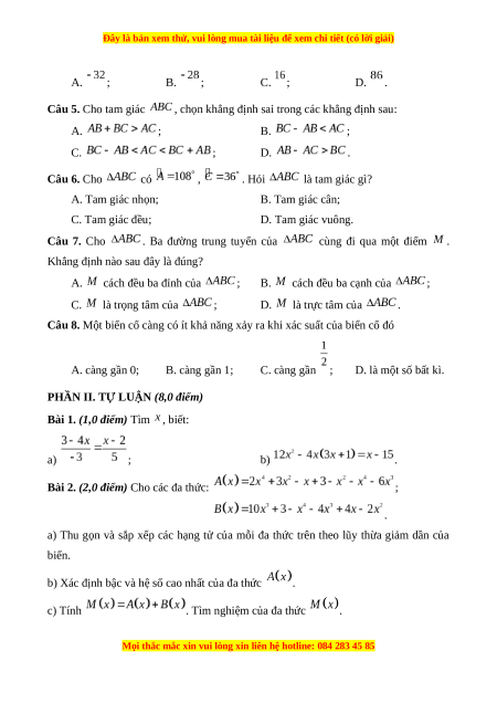 Bài 2. (2,0 điểm) Cho các đa thức: ; .