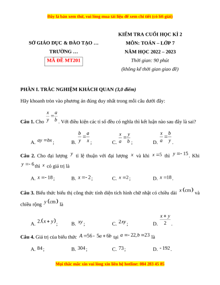 ĐỀ KIỂM TRA CUỐI HỌC KÌ 2 MÔN: TOÁN – LỚP 7