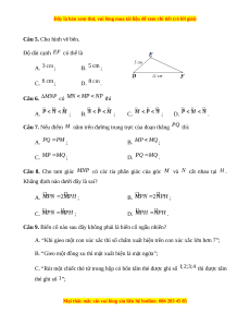 Câu 5. Cho hình vẽ bên. Độ dài cạnh có thể là A. ; B. ; C. ; D. . Câu 6. có thì A. ; B. ; C. ; D. . Câu 7. Nếu điểm