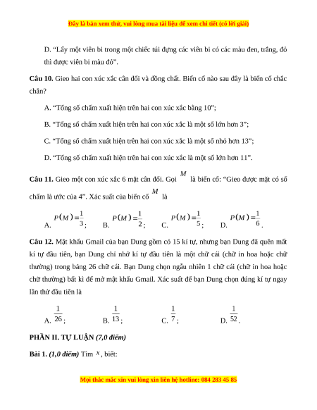 Câu 10. Gieo hai con xúc xắc cân đối và đồng chất. Biến cố nào sau đây là biến cố chắc chắn?