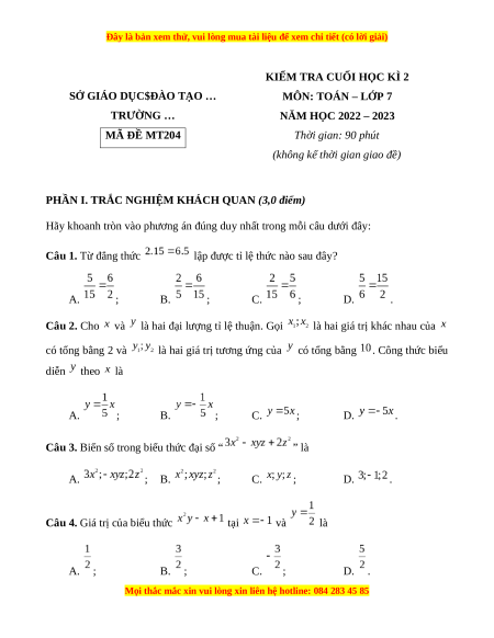 NĂM HỌC 2022 – 2023 MÃ ĐỀ MT204 Thời gian: 90 phút