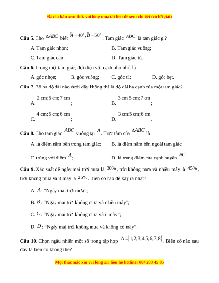 Câu 5. Cho biết . Tam giác là tam giác gì? A. Tam giác nhọn; B. Tam giác vuông; C. Tam giác cân; D. Tam giác tù.