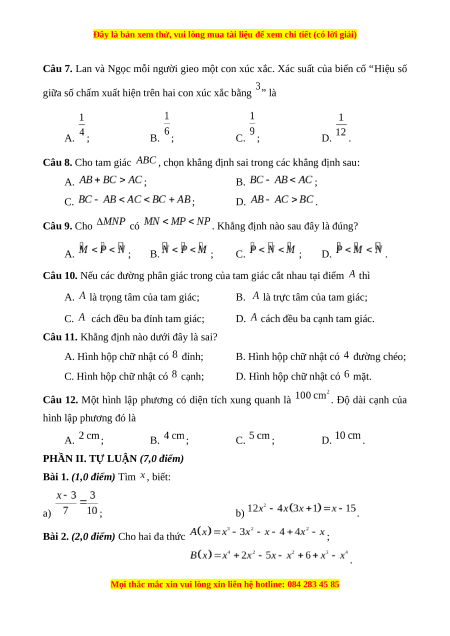 giữa số chấm xuất hiện trên hai con xúc xắc bằng ” là A. ; B. ; C. ; D. . Câu 8. Cho tam giác