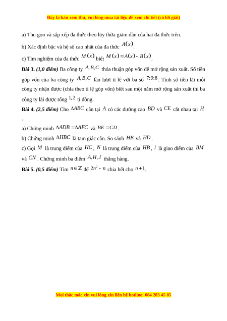 Bài 2. (2,0 điểm) Cho hai đa thức ; .