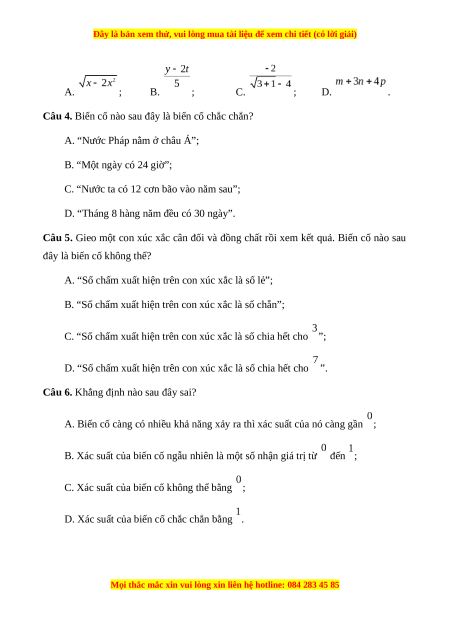 Câu 5. Gieo một con xúc xắc cân đối và đồng chất rồi xem kết quả. Biến cố nào sau