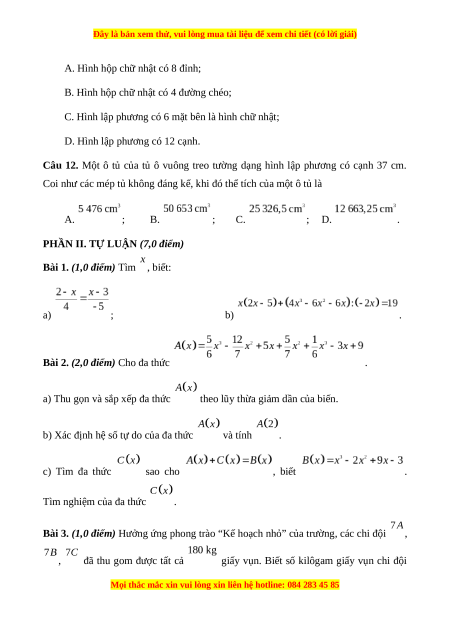 Câu 12. Một ô tủ của tủ ô vuông treo tường dạng hình lập phương có cạnh 37 cm.