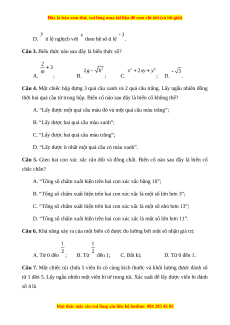 Câu 6. Khả năng xảy ra của một biến cố được đo lường bởi một số nhận giá trị: A. Từ 0 đến ; B. Từ đến 1; C. Bất kì; D. Từ 0 đến 1.