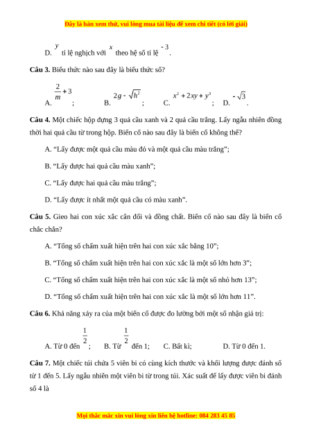 Câu 7. Một chiếc túi chứa 5 viên bi có cùng kích thước và khối lượng được đánh số