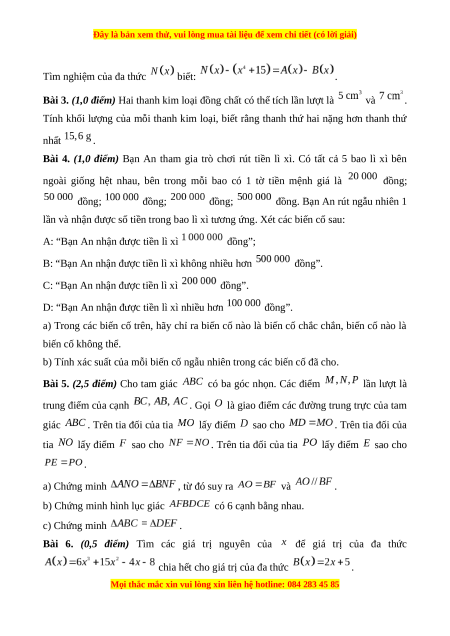 Bài 6. (0,5 điểm) Tìm các giá trị nguyên của để giá trị của đa thức