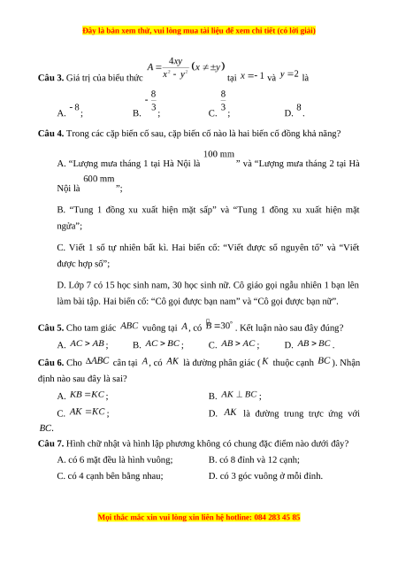 Câu 4. Trong các cặp biến cố sau, cặp biến cố nào là hai biến cố đồng khả năng?