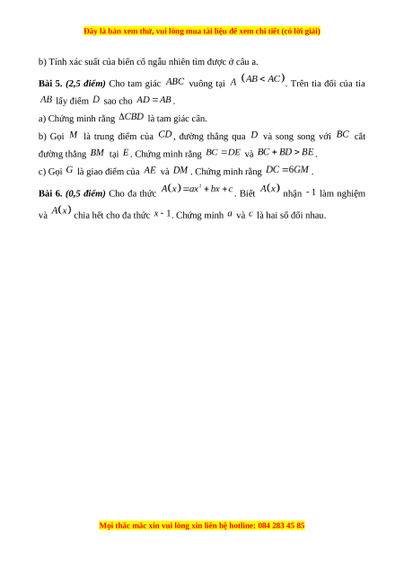 Bài 6. (0,5 điểm) Cho đa thức . Biết nhận làm nghiệm và chia hết cho đa thức