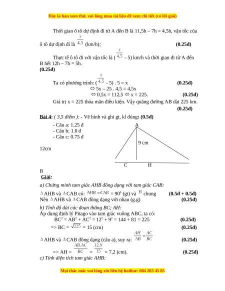Giá trị x = 225 thỏa mãn điều kiện. Vậy quãng đường AB dài 225 km. (0.25đ)