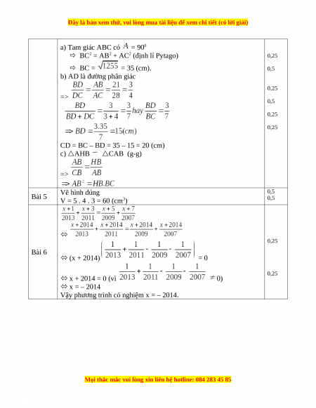 CD = BC – BD = 35 – 15 = 20 (cm) c) AHB CAB (g-g) => Vẽ hình đúng 0,5 Bài 5 V = 5 . 4 . 3 = 60 (cm3) 0,5 0,25 Bài 6 (x + 2014) = 0 0,25 x + 2014 = 0 (vì 0) x = – 2014
