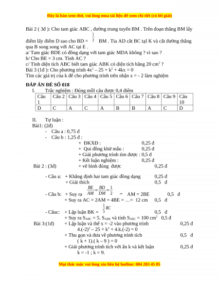 Tìm các giá trị của k để cho phương trình trên nhận x = - 2 làm nghiệm ĐÁP ÁN ĐÈ SỐ 018 I.