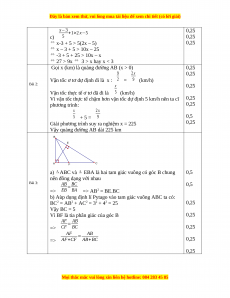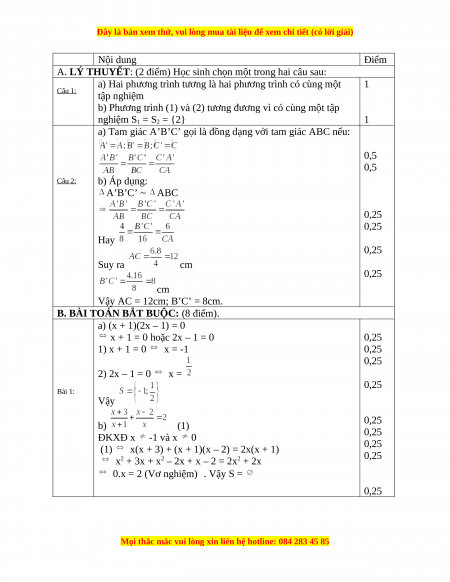 B. BÀI TOÁN BẮT BUỘC: (8 điểm). a) (x + 1)(2x – 1) = 0 x + 1 = 0 hoặc 2x – 1 = 0 0,25 1) x + 1 = 0 x = -1 0,25 0,25 2) 2x – 1 = 0 x = 0,25 Bài 1: Vậy b) (1) 0,25 ĐKXĐ x -1 và x 0 0,25 (1)