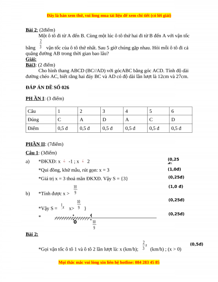 đường chéo AC, biết rằng hai đáy BC và AD có độ dài lần lượt là 12cm và 27cm. ĐÁP ÁN DỀ SỐ 026 PH ẦN I: (3 điểm) Câu 1 2 3 4 5 6 Đúng C A D A C D Điểm 0,5 đ 0,5 đ 0,5 đ 0,5 đ 0,5 đ 0,5 đ PHẦN II: (7điểm) Câu 1: (3điểm) a) *ĐKXĐ: x (0,25 ¿ -1 ; x ¿ 2 đ)