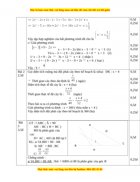 Vậy diện tích đội phải cày theo kế hoạch là 360 (ha) 0,25đ Bài GT : ABC ; Â = 90 A 3 AH BC ( H BC ) 3,5đ BD là phân giác của D D AC ; AH cắt BD tại I 0,5đ KL: a/ IA.BH = IH . AB I C b/ AB = BH . BC B H C/ Chứng minh : 0,25đ