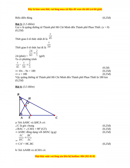 Vậy quãng đường từ Thành phố Hồ Chí Minh đến Thành phố Phan Thiết là 180 km (0,25đ) Bài 4: (3,5 điểm) B H I A E C a/ Xét ∆ABC và ∆HCA có: C là góc chung (0,25đ) BAC = CHA = 900 (GT) (0,25đ)