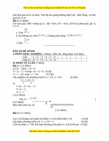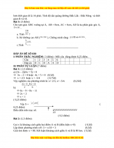 Cho tam giác ABC vuông tại A, AB = 8cm, AC = 6cm, AD là tia phân giác góc A, . a. Tính ? b. Kẻ đường cao AH ( ). Chứng minh rằng: . c.Tính ĐÁP ÁN ĐỀ SỐ 030