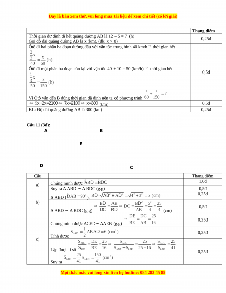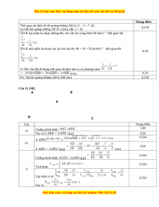 KL: Độ dài quãng đường AB là 300 (km) 0,25đ Câu 11 (3đ): A B E D C Câu Thang điểm a) Chứng minh được 1,0đ Suy ra Δ ABD ∽ Δ BDC (g.g) 0,5đ 0,25đ Δ ABD ( ): b) 0,5đ Δ ABD ∽ Δ BDC (g.g) (cm) 0,25đ