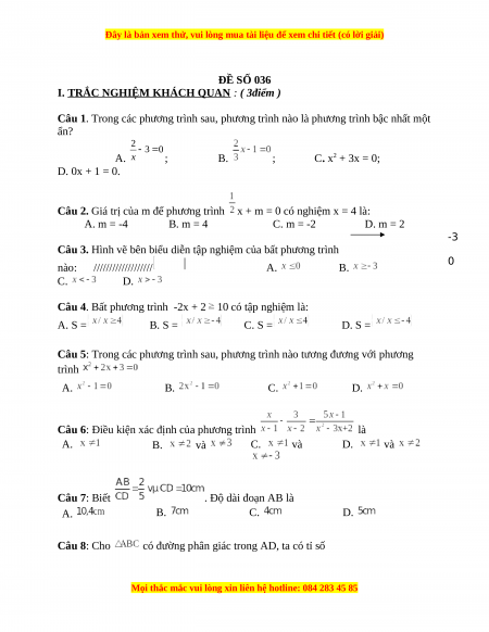 Câu 1. Trong các phương trình sau, phương trình nào là phương trình bậc nhất một ẩn? 2 3 0 A. x ; B. ; C. x2 + 3x = 0; D. 0x + 1 = 0.