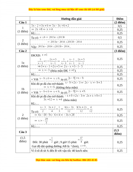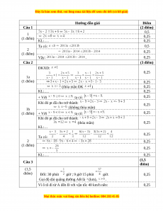 Hướng dẫn giải Điểm Câu 1 (2 điểm) 0,5 1 0,25 (1 điểm) KL:…. 0,25 Ta có: 0,5 2 (1 điểm) 0,25 Vậy: . 0,25 Câu 2 (3 điểm) ĐKXĐ: 0,25 1a (1 điểm) 0,25 (thỏa mãn ĐK ) 0,25 KL:…. 0,25 + Với ta có: 0,25