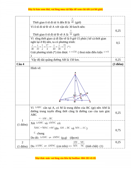 Vậy độ dài quãng đường AB là 150 km. 0,25 Câu 4 (3 điểm) Hình vẽ: A 1 j N E D 2 1 O 1 B M C Vì
