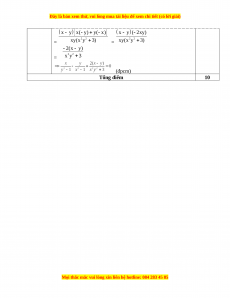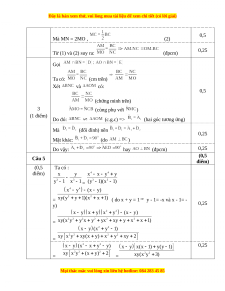 0,5 Mà MN = 2MO , (2) 0,25 Từ (1) và (2) suy ra: (đpcm) Gọi Ta có: (cm trên) Xét và có: 0,5 (chứng minh trên) 3 (cùng phụ với ) (1 điểm) Do đó: (c.g.c) => (hai góc tương ứng) Mà (đối đỉnh) nên 0,25 Mặt khác: (do ) Do vậy: hay (đpcm) 0,25 (0,5 Câu 5 điểm) (0,5 Ta có : điểm) x y 4 4 x x y y 3 3 y 1 x 1 3 3 = (y 1)(x 1) 4 4 x y (x y) 2 2