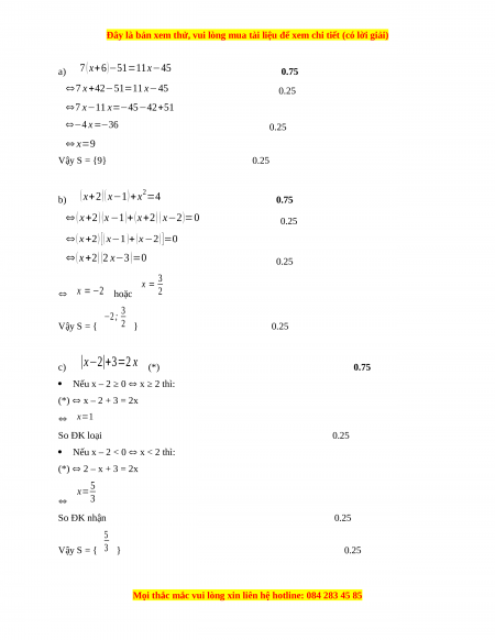 ⇔7 x−11 x=−45−42+51 ⇔−4 x =−36 0.25 ⇔ x=9 Vậy S = {9} 0.25 b)