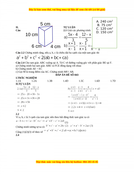 ĐÁP ÁN ĐỀ SỐ 043 I.TRẮC NGHIỆM 1.1A 1.2A 1.3B 1.4D 1.5C 1.6D 1.7D II.TỰ LUẬN 2.2