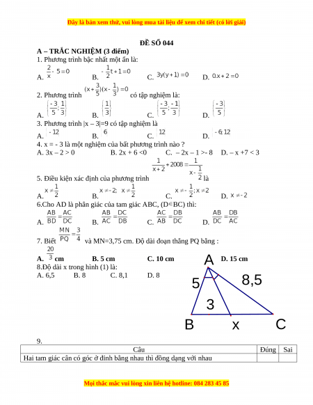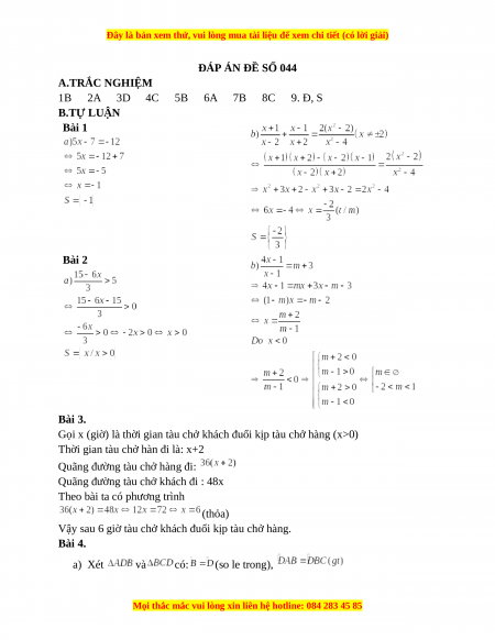 ĐÁP ÁN ĐỀ SỐ 044 A.TRẮC NGHIỆM 1B 2A 3D 4C 5B 6A 7B 8C 9. Đ, S B.TỰ LUẬN Bài 1 Bài 2 Bài 3.