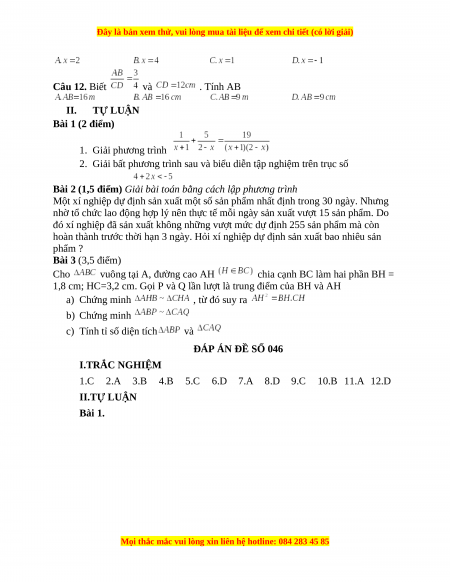 ĐÁP ÁN ĐỀ SỐ 046 I.TRẮC NGHIỆM 1.C 2.A 3.B 4.B 5.C 6.D 7.A 8.D 9.C 10.B 11.A 12.D II.TỰ LUẬN Bài 1.