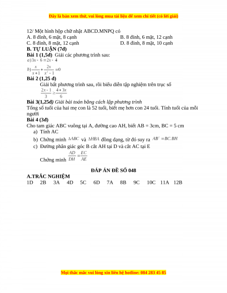 ĐÁP ÁN ĐỀ SỐ 048 A.TRẮC NGHIỆM 1D 2B 3A 4D 5C 6D 7A 8B 9C 10C 11A 12B
