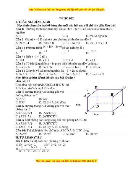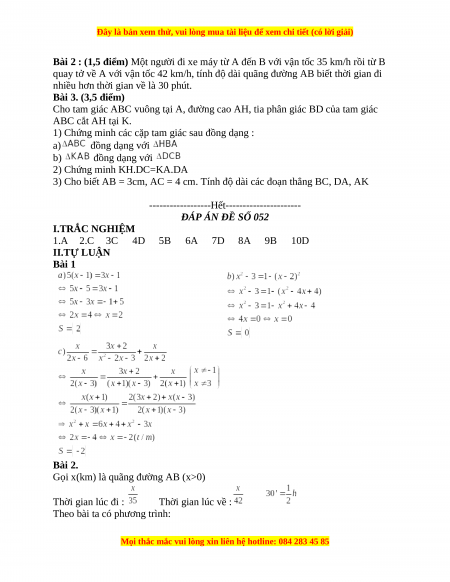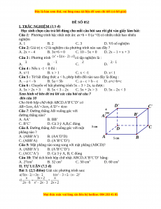 ĐÁP ÁN ĐỀ SỐ 052 I.TRẮC NGHIỆM 1.A 2.C 3C 4D 5B 6A 7D 8A 9B 10D II.TỰ LUẬN Bài 1 Bài 2.