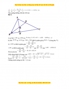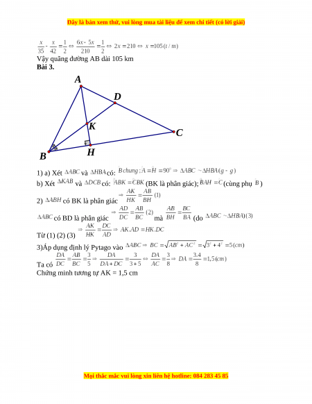 Vậy quãng đường AB dài 105 km Bài 3. A D K C H B 1) a) Xét và có: b) Xét và có: (BK là phân giác); (cùng phụ ) 2) có BK là phân giác có BD là phân giác mà (do Từ (1) (2) (3)