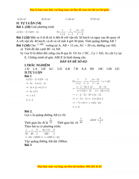ĐÁP ÁN ĐỀ SỐ 055 I.TRẮC NGHIỆM 1.D 2.A 3.B 4.C 5.D 6.B 7.B 8.A 9D 10C 11B 12C II.TỰ LUẬN Bài 1 Bài 2.