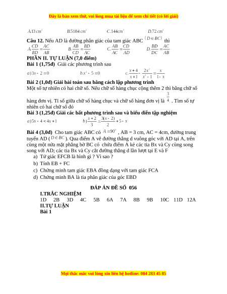 ĐÁP ÁN ĐỀ SỐ 056 I.TRẮC NGHIỆM 1D 2B 3D 4C 5B 6A 7A 8B 9B 10C 11D 12A II.TỰ LUẬN Bài 1