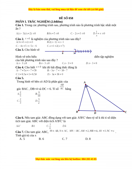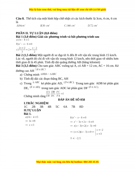 ĐÁP ÁN ĐỀ SỐ 058 I.TRẮC NGHIỆM 1C 2B 3B 4B 5C 6A 7B 8D II.TỰ LUẬN Bài 1.