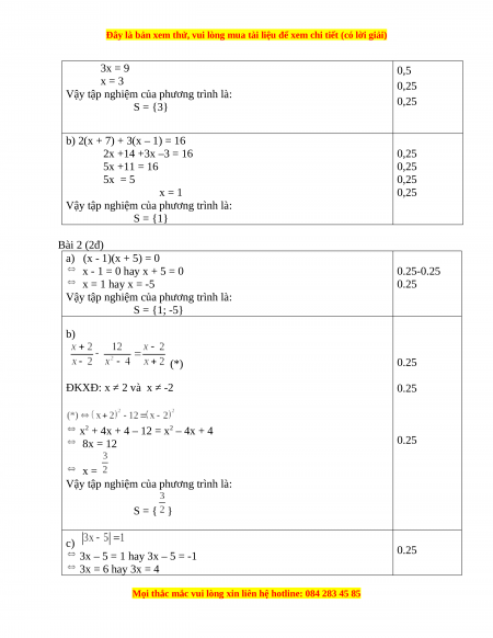 Vậy tập nghiệm của phương trình là: S = {3} 0,25 b) 2(x + 7) + 3(x – 1) = 16 2x +14 +3x –3 = 16 0,25 5x +11 = 16 0,25 5x = 5 0,25