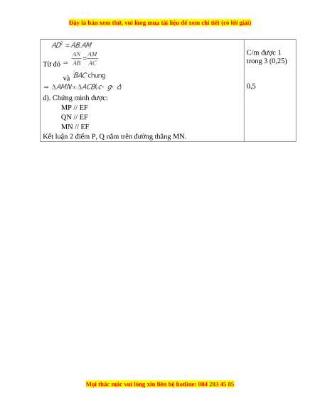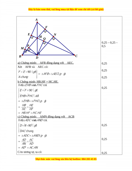 A F E N H Q 0,25 – 0,25 – P 0,5 M B D C a) Chứng minh: A FB đồng dạng với A EC. 0,25 Xét AFB và AEC có: 0,25 0,25 b Chứng minh: HB.HF = HC.HE. 0,25 c) Chứng minh: A MN đồng dạng với A CB 0,25 0,25 C/m tương tự, ta có: 0,25