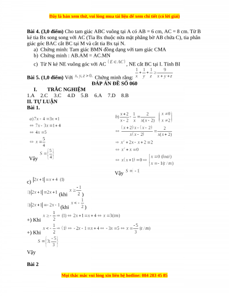 ĐÁP ÁN ĐỀ SỐ 060 I. TRẮC NGHIỆM 1.A 2.C 3.C 4.D 5.B 6.A 7.D 8.B II. TỰ LUẬN Bài 1. Vậy Vậy c) (khi ) (khi ) +) Khi +) Khi Vậy Bài 2