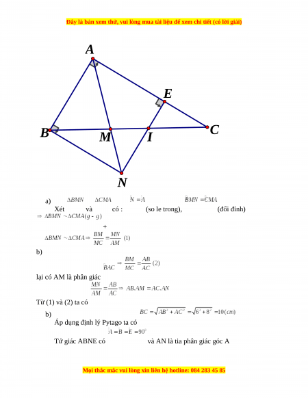 c) Từ N kẻ NE vuông góc với AC , NE cắt BC tại I. Tính BI