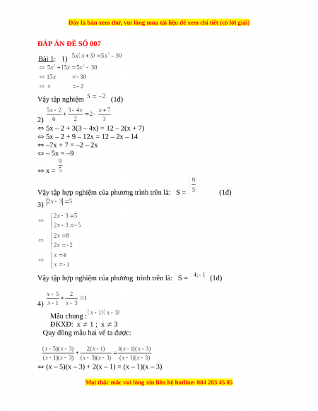 ĐÁP ÁN ĐỀ SỐ 007 Bài 1: 1) Vậy tập nghiệm (1đ) 2)