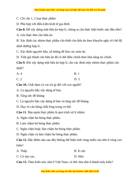 Câu 9. Khi xây dựng một bữa ăn hợp lí, cần xác định mấy nhóm thực phẩm cần thiết? A. 4 B. 1 C. 2 D. 3