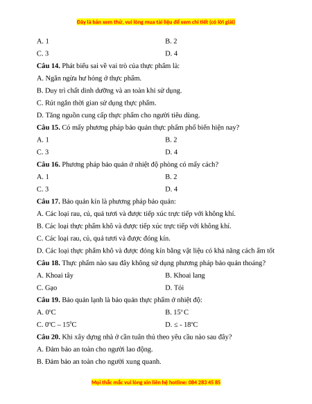 Câu 16. Phương pháp bảo quản ở nhiệt độ phòng có mấy cách? A. 1 B. 2 C. 3 D. 4