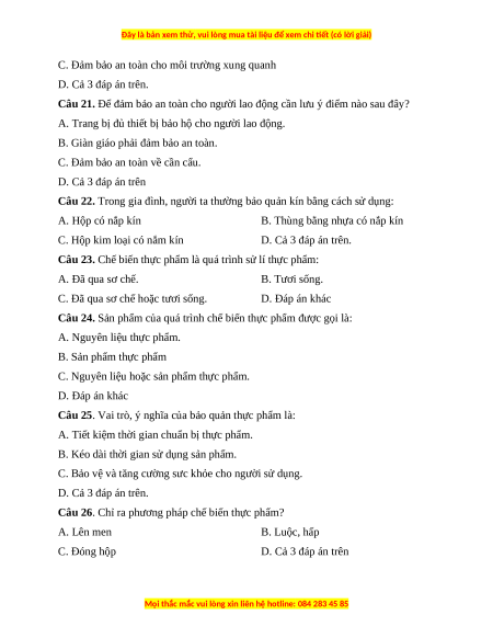 Câu 26. Chỉ ra phương pháp chế biến thực phẩm? A. Lên men B. Luộc, hấp C. Đóng hộp D. Cả 3 đáp án trên