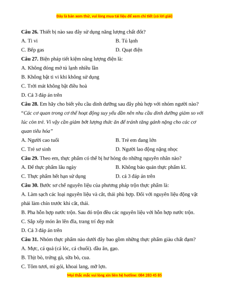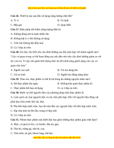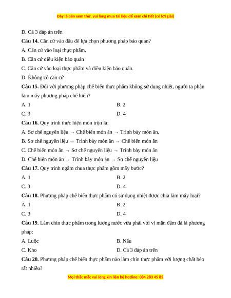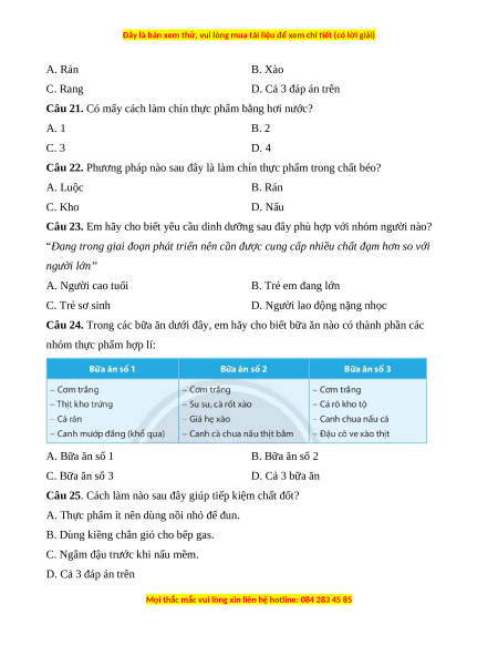 Câu 19. Làm chín thực phẩm trong lượng nước vừa phải với vị mặn đậm đà là phương pháp: A. Luộc B. Nấu C. Kho D. Cả 3 đáp án trên