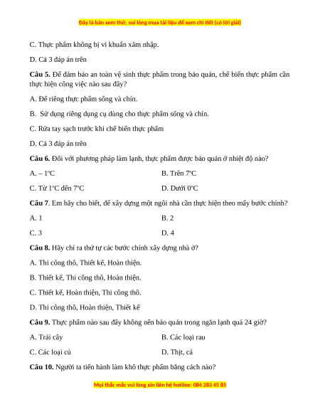 Câu 5. Để đảm bảo an toàn vệ sinh thực phẩm trong bảo quản, chế biến thực phẩm cần